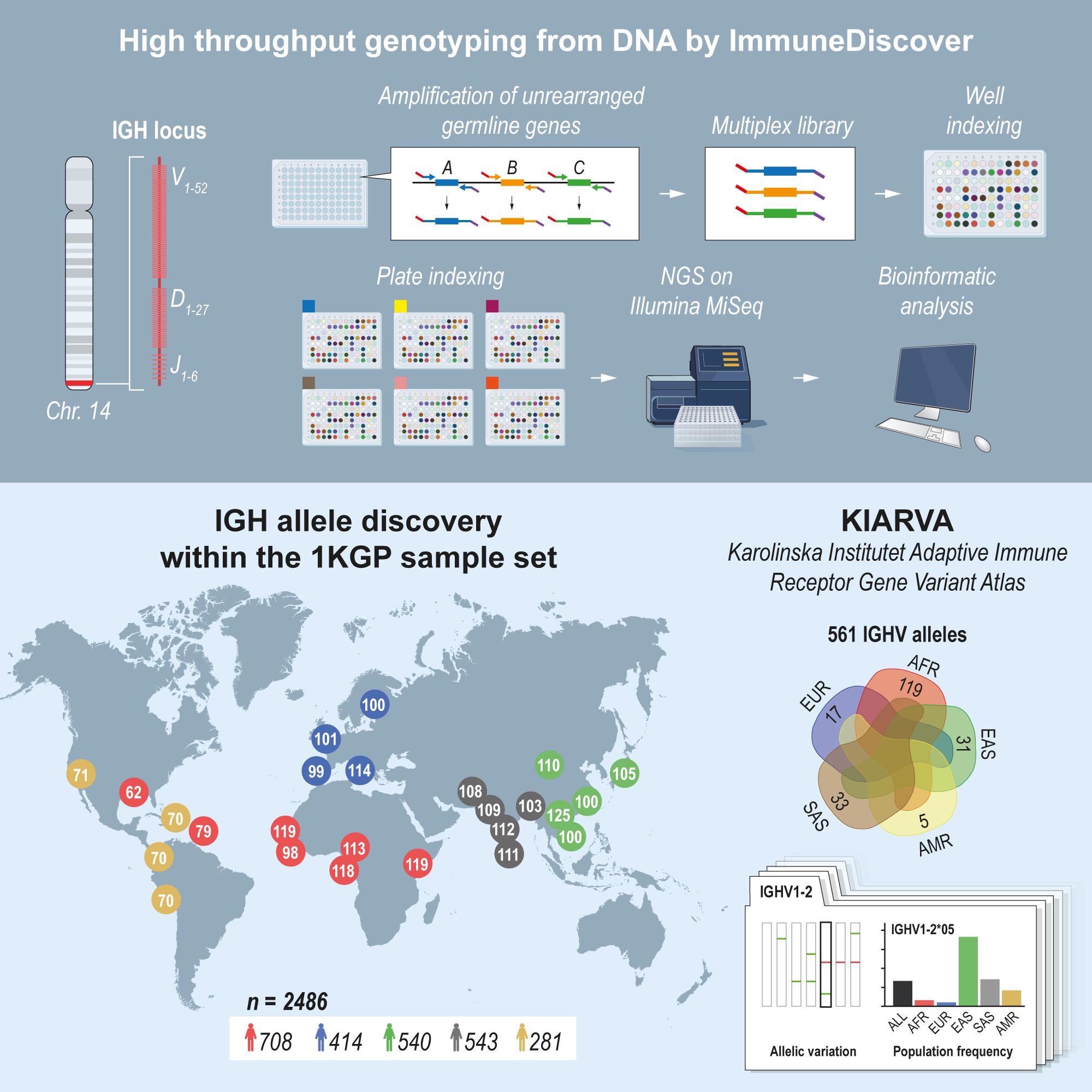 The genes of the immunoglobulin heavy chain (IGH) locus are critical for the formation of antibodies. Previous studies using limited numbers of individuals have indicated that IG germline genes are highly variable between persons. In Corcoran et al., we present a novel method for high-throughput sequencing of the functional adaptive immune genes located in complex genomic regions, and we utilize this technique to genotype 2486 individuals from the 1KGP population set, comprising 25 sub-populations.